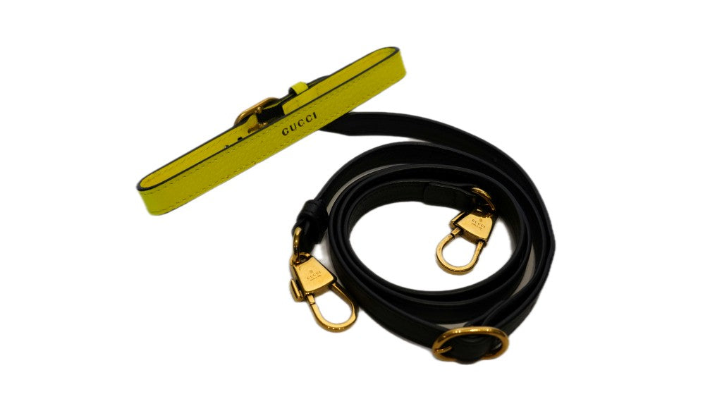 Borsa shopping Gucci Diana misura grande, con manici in bamboo, tracolla amovibile e laccetti giallo fluo sui manici amovibili. Internamente sono presenti due scomparti con da un lato una tasca e dall'altro lato una tasca chiusa con la zip. Centralmente presenta un'altro scomparto con cerniera. La borsa si chiude tramite una patta che si chiude con un automatico. La borsa si può tenere a mano oppure a tracolla, rimane molto elegante e raffinata con un tocco di colore dato dai laccetti. (Prezzo retail misura media € 3.600 )