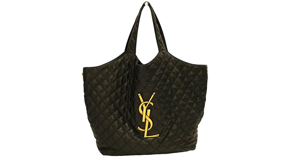 Maxi Shopping Bag Icare di Saint Laurent. Realizzata in pelle di agnello trapuntata nera con l'iconico logo Cassandre YSL in metallo color bronzo anticato. Pochette interna amovibile e completa di tutto, dust e cartellini. Scorrendo nelle foto è presente il codice del prodotto. (Prezzo di retail 4.200 euro)