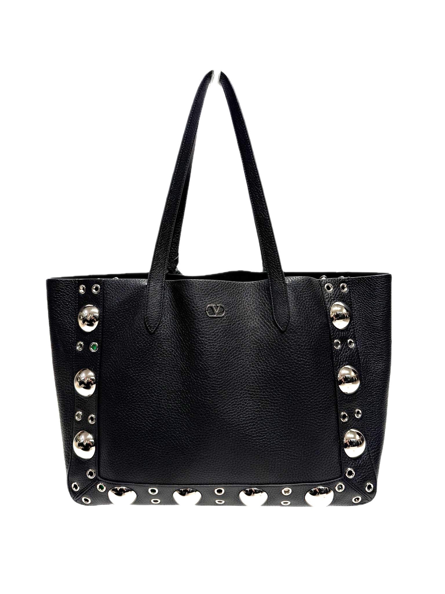 Borsa modello nellcòte misura medium shopper in pelle di vitello granato di colore nero. Con borchie sferiche e rivetti lungo i lati, frontalmente è presente un VLogo in metallo, piccolino. Internamente vi è uno scomparto unico principale con pochettina inclusa, che si può rimuovere. Fodera interna in suede. Cartellino e Dustbag inclusa.