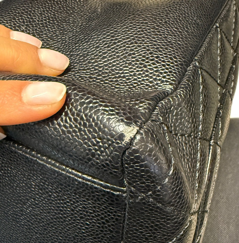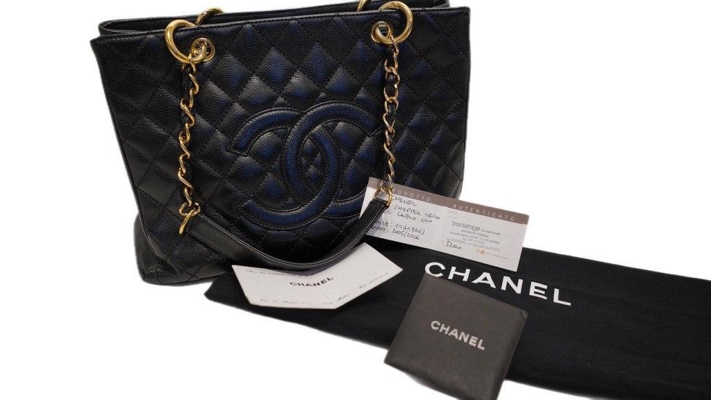 Borsa modello shopping CHANEL Caviar Grand GST in nero GHW. In morbida pelle caviar nero trapuntata a rombi. La borsa è dotata di manici con maglie di catena dorata infilate con spalline in pelle per aumentare il sostegno e il confort. Sula spalla è presente solo della comoda pelle. Frontalmente è presente un logo Chanel CC cucito e vi è una tasca posteriore. La cerniera superiore si apre su un interno in tessuto nero con cerniera e tasche applicate. Con sacchetto antipolvere cartellini e card.