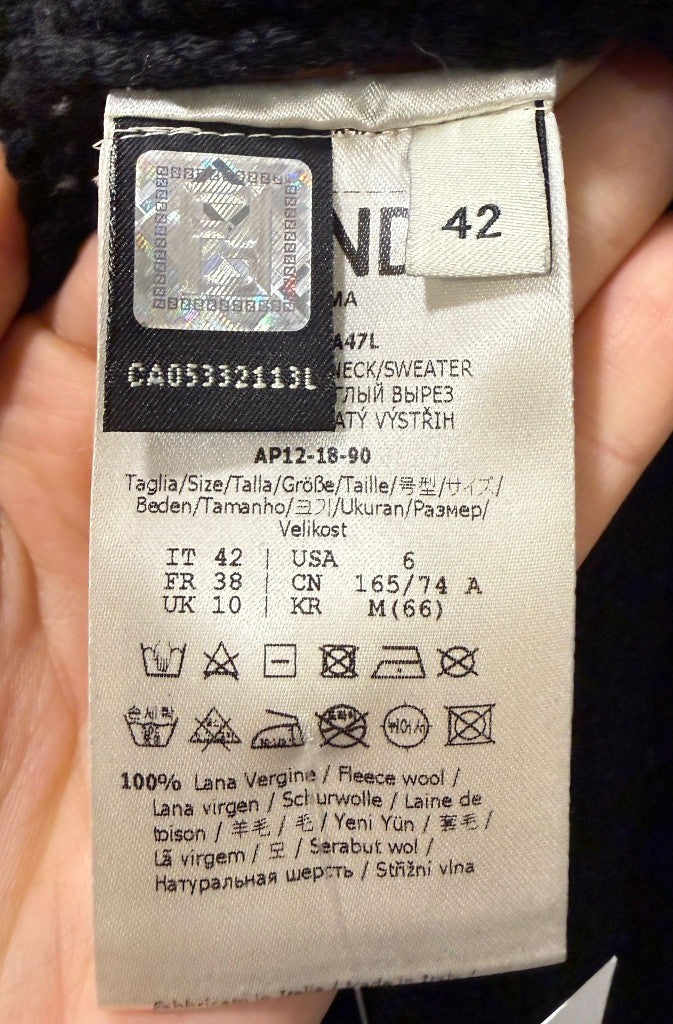 Maglione pesante girocollo nero di fendi in lana con scritta "FENDI" rossa sul davanti, il resto del maglione è nero semplice. La taglia è 42.